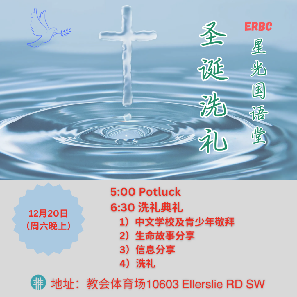 下次洗礼时间:2025年圣诞节,详情请与周其兴弟兄Charlie Zhou联系